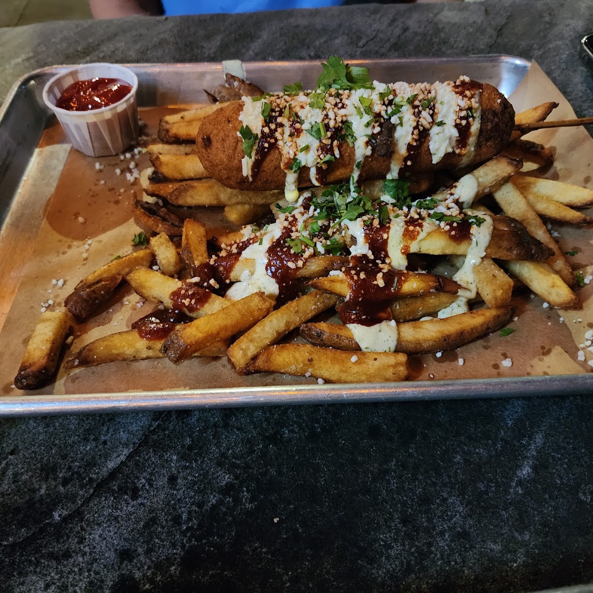 The menu leans into elevated pub fare with a local twist. Small plates like jalapeno boiled peanuts and roasted carrot hummus make for approachable starters, while loaded fries topped with hearty braised oxtail chili stand out as a filling, indulgent choice. House-made sauces like Guajillo ketchup and Hipster ranch add distinct flavors to their hand-cut fries. Larger options, such as salads or smoked pork nachos, reflect the gastropub’s commitment to quality portions and balanced flavors that pair well with their drinks.